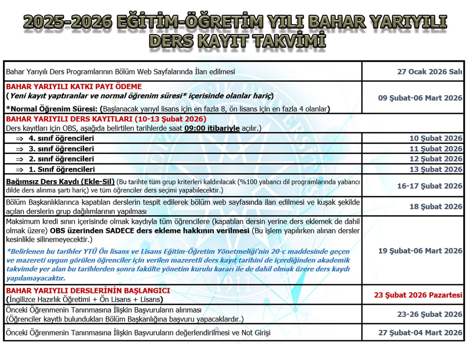 Belirlenen bu tarihler (19 Şubat-06 Mart 2026) YTÜ Önlisans ve Lisans Eğitim-Öğretim Yönetmeliği'nin 20-c maddesinde geçen ve mazereti uygun görülen öğrenciler için verilen mazeretli ders kayıt tarihini de içerdiğinden akademik takvimde yer alan bu tarihlerden sonra fakülte yönetim kurulu kararı ile de dahil olmak üzere ders kaydı yapılamayacaktır.